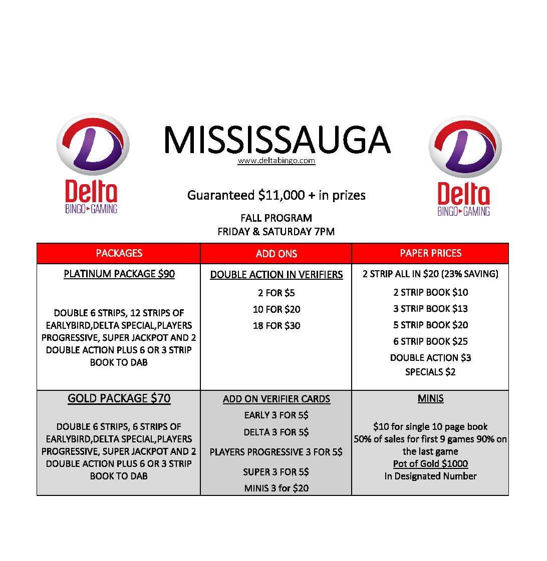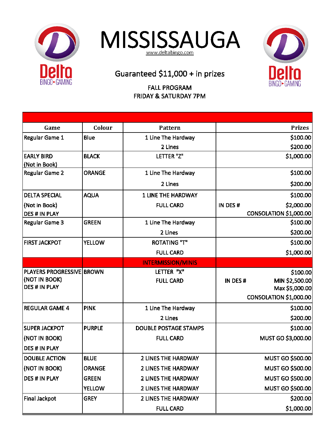 *Des frais d’avance de fonds peuvent s’appliquer aux achats en ligne; Delta Bingo & Gaming n’est pas responsable des frais additionnels imposés.